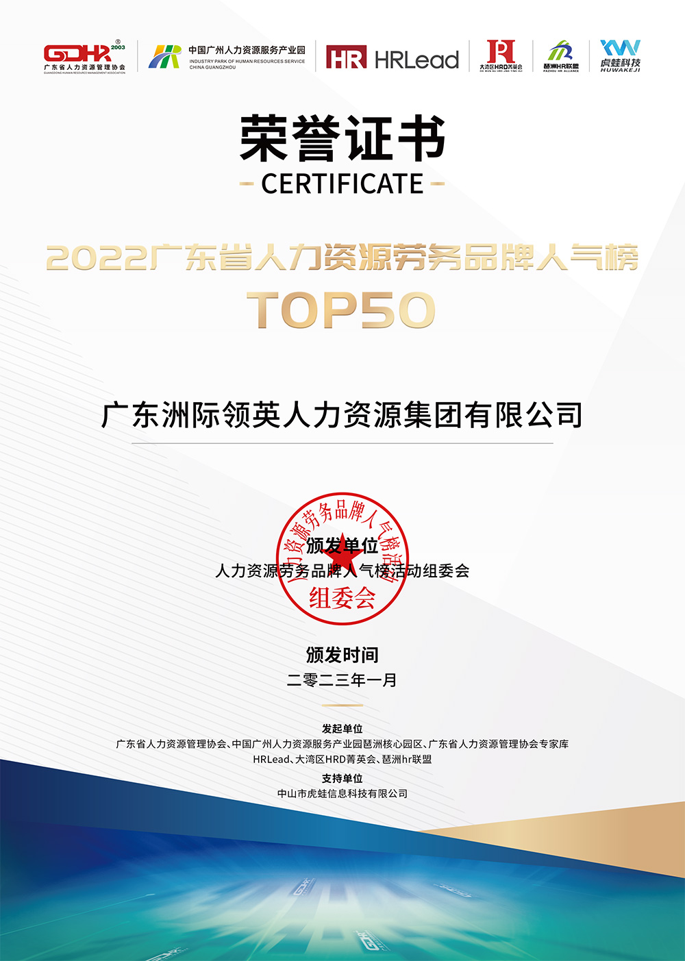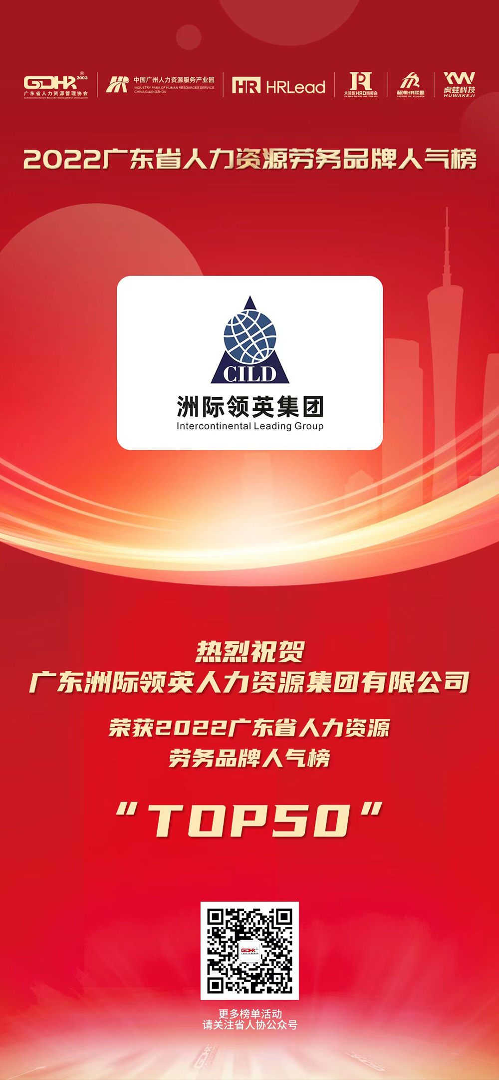 熱烈祝賀廣東洲際領(lǐng)英人力資源集團有限公司榮獲2022廣東省人力資源勞務(wù)品牌"Top50"