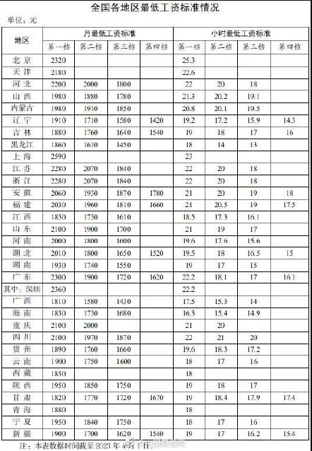 人社部網(wǎng)站近日發(fā)布了全國各地區(qū)最低工資標(biāo)準(zhǔn)情況(截至2023年4月1日),15個(gè)地區(qū)月最低工資標(biāo)準(zhǔn)在2000元及以上。其中,上海以2590元仍居榜首。其次是深圳,月最低工資標(biāo)準(zhǔn)達(dá)到2360元。北京排第三,月最低工資標(biāo)準(zhǔn)達(dá)到2320元。從小時(shí)最低工資標(biāo)準(zhǔn)來看,北京小時(shí)最低工資標(biāo)準(zhǔn)為25.3元,為全國最高。
