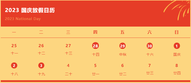 根據節(jié)假日安排的通知,現(xiàn)將2023年中秋節(jié)、國慶節(jié)放假日期安排通知如下: