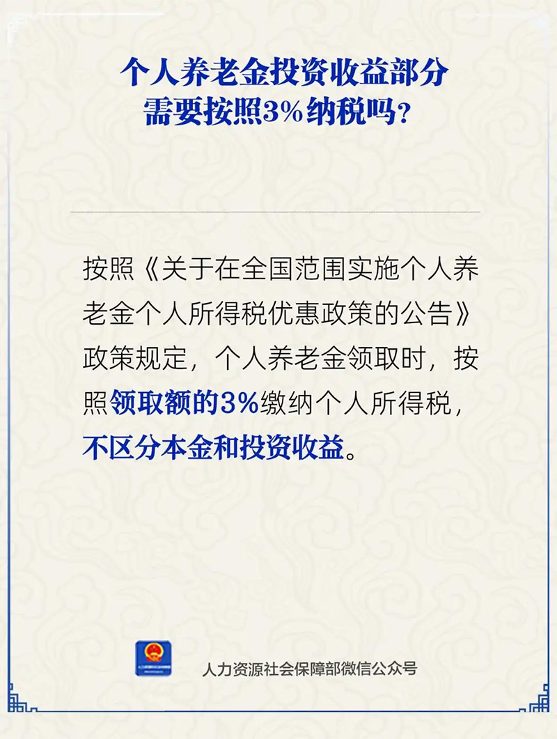 個(gè)人養(yǎng)老金投資收益部分需要按照3%納稅嗎?人社部24日通過官方微信公眾號(hào)作出解答。